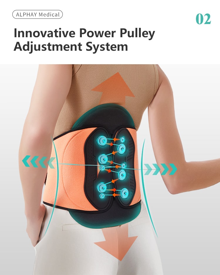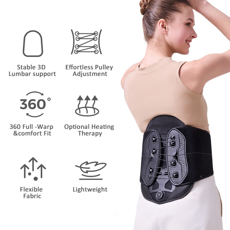 This ergonomic back support belt features a widened thickened back plate for stable 3D lumbar support, an innovative power pulley system for effortless, precise fit adjustment, and a 360° full-wrap design that conforms to your natural waist curve—delivering even pressure distribution without restricting movement. It eases muscle strain, protects the spine and joints for all-day comfortable wear, and offers an optional heating pad with golden-wave therapy and constant-temperature hot compress for targeted warmth and deep muscle relief, perfect for daily use, long hours of sitting, home and office scenarios.