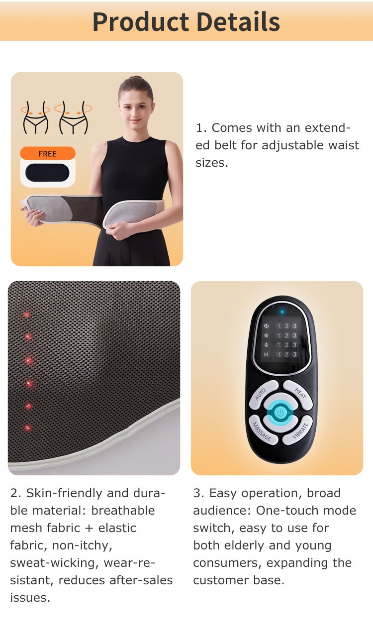 Simulates professional massage techniques, deeply relaxing pain points in the waist, and targeting areas affected by lumbar strain.